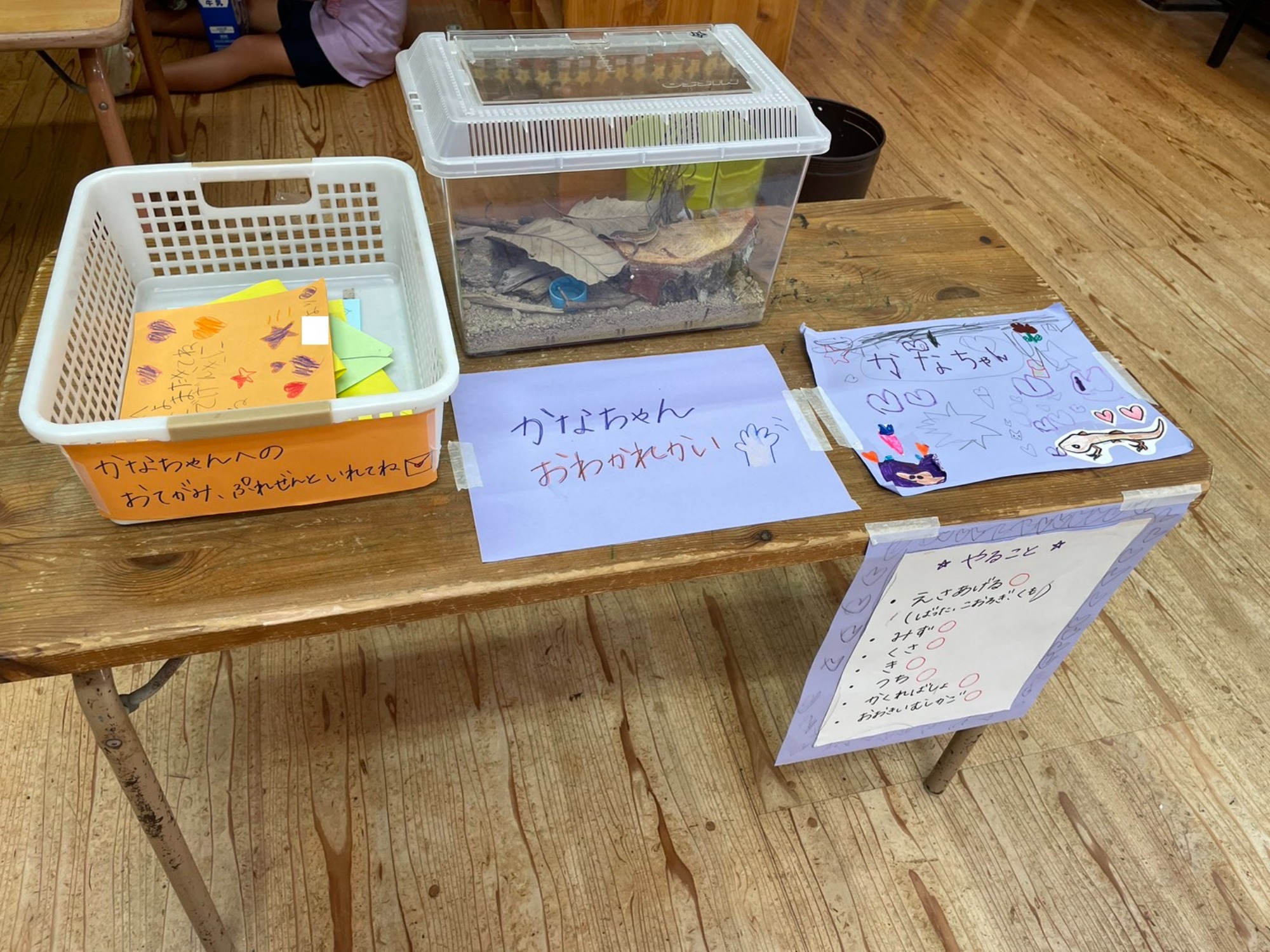夏が終わり、かなちゃんのエサ(ちょうどいい大きさの生きている虫)が園内にいなくなってきて、捕まえられなくなってきたことに、こどもたち自身が気づきました。
